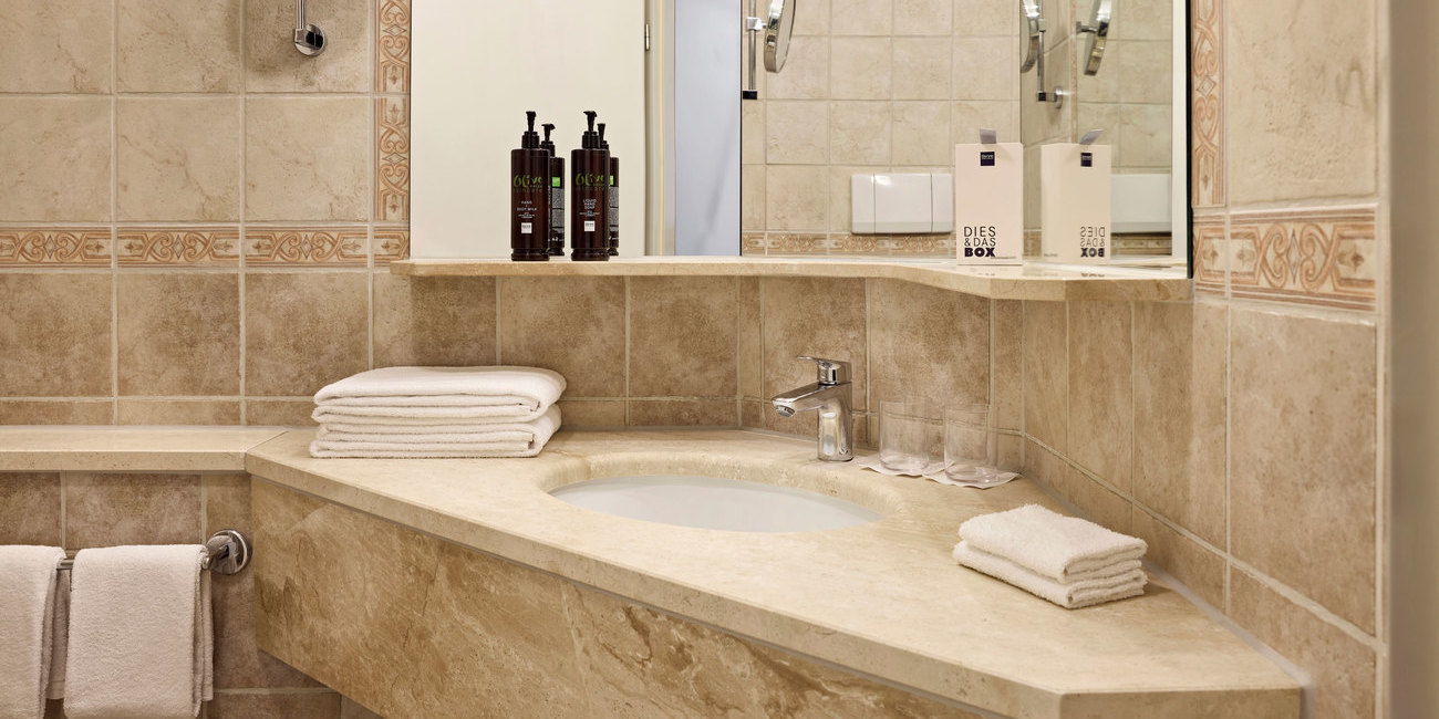 Für zusätzlichen Komfort sorgen Fußbodenheizung, Handtuchwärmer und teilweise Klimaanlage im Zimmer. Eine Minibar, eine Sitzecke, ein Flachbildfernseher, ein Safe und ein Arbeitsplatz runden die Ausstattung ab.